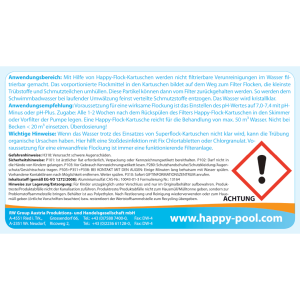 Voraussetzung für eine wirksame Flockung ist das Einstellen des pH-Wertes auf 7,0-7,2 mit pH-Minus oder pH-Plus. Zugabe: alle 1-2 Wochen nach dem Rückspülen des Filters Happy-Flock-Kartuschen in den Skimmer oder Vorfilter der Pumpe legen. Eine Happy-FLock-Kartusche reicht für die Behandlung von max. 50m³ Wasser. Nicht bei Becken <20m³ einsetzen!