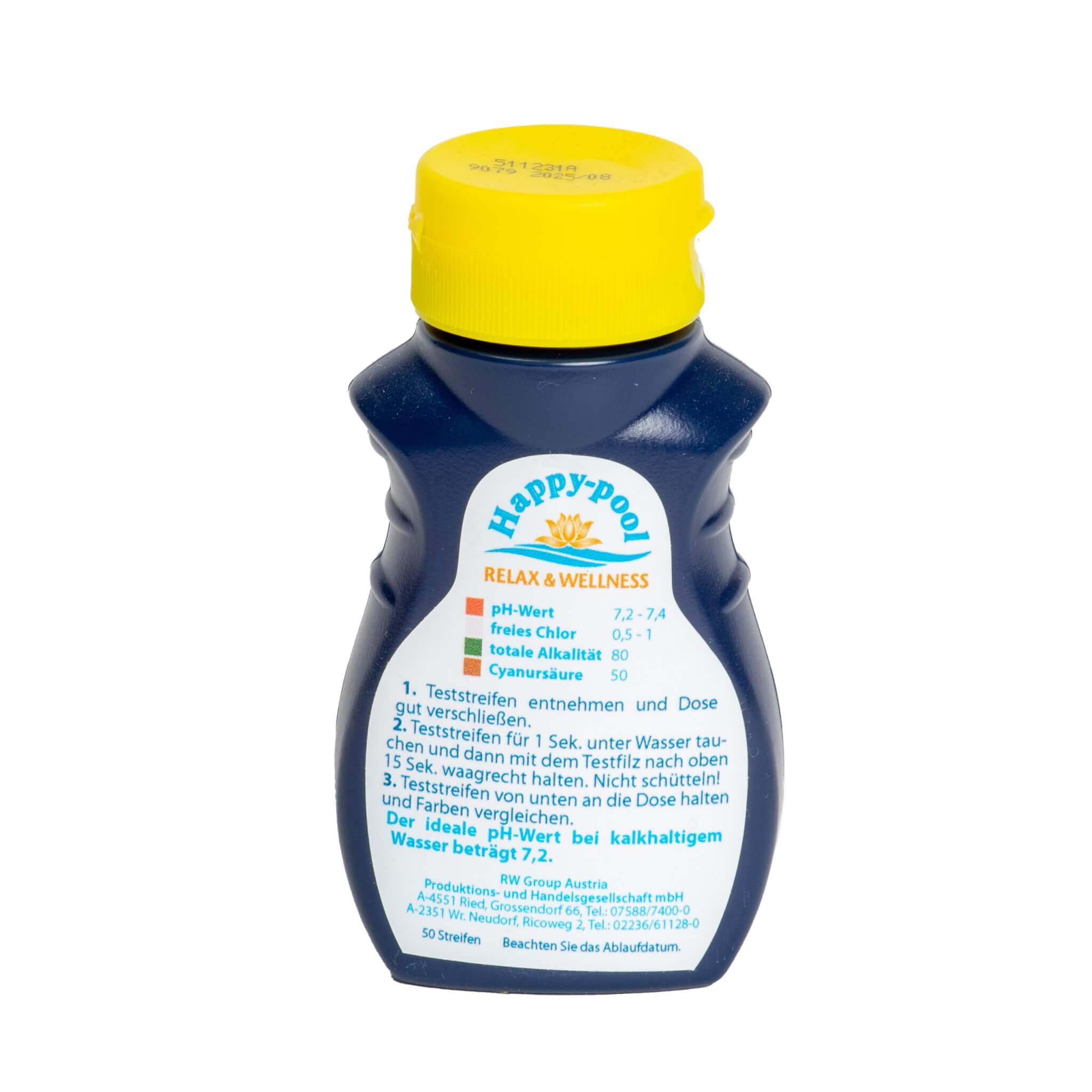 Mit dem Happy-pool “Testreifen” können Sie 4 Werte auf einmal messen. Den pH-Wert, das freie Chlor, die totale Alkalität und die Cyanursäure. Inhalt: 50 Streifen.