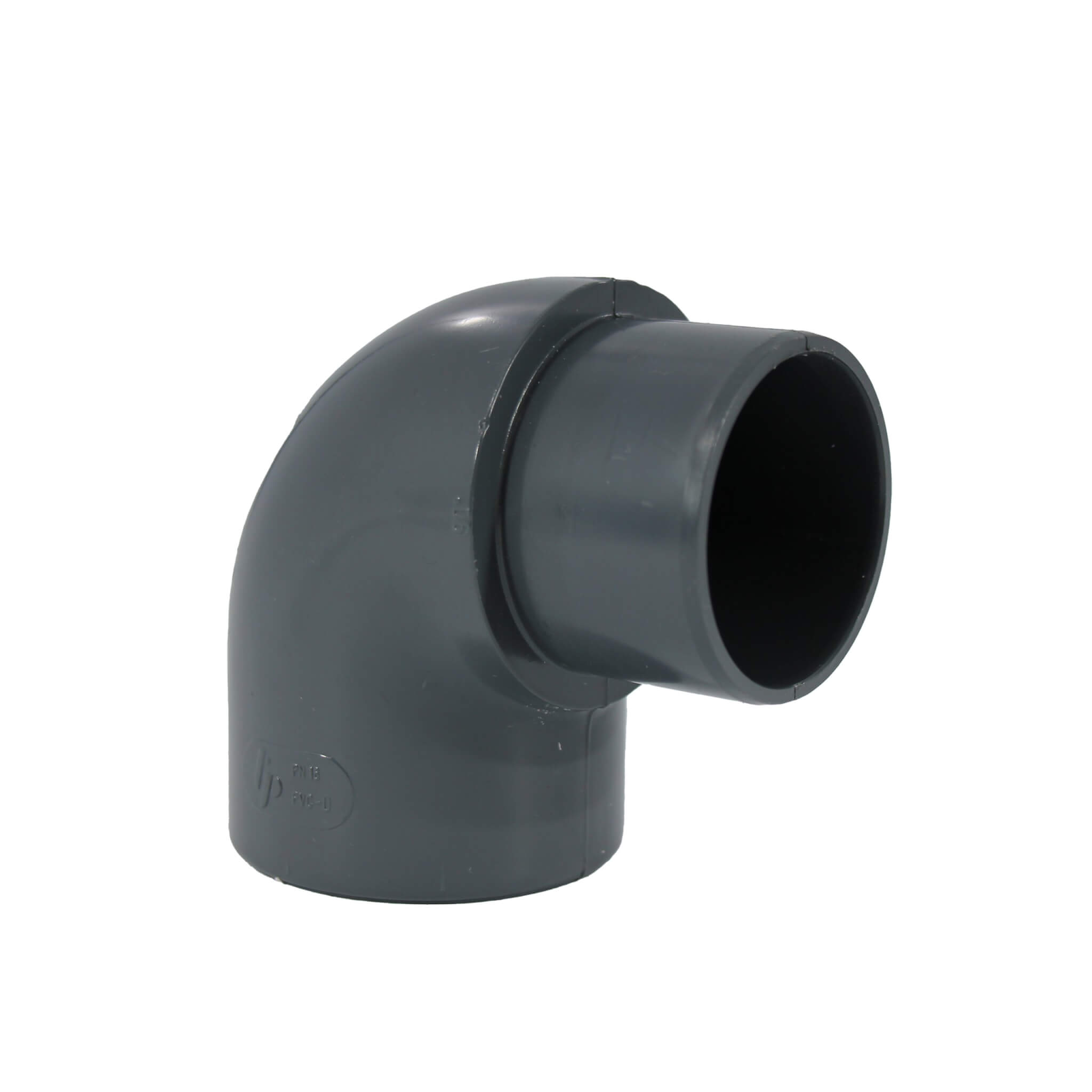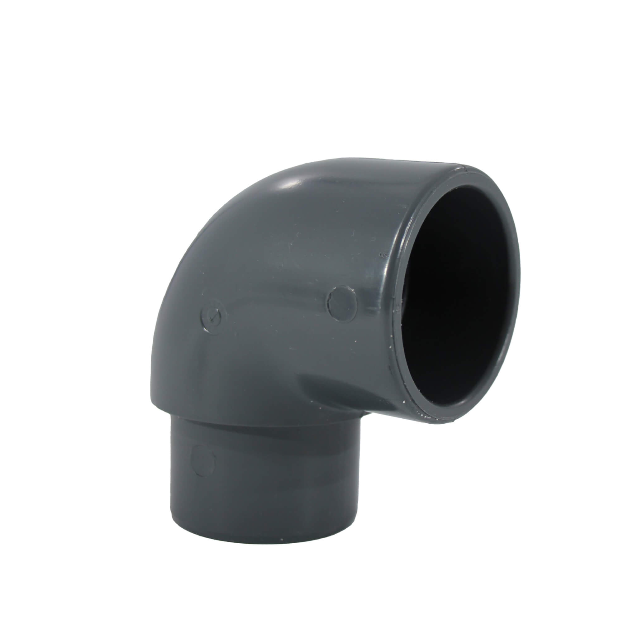 PVC-Winkel 90° mit einem Durchmesser von 50 mm innen/außen, ideal zur Richtungsänderung und Reduzierung von Rohrleitungsdurchmessern.